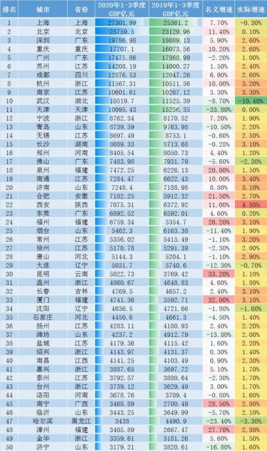 11月12日,2020年前三季度中国城市(大陆)GDP前50强名单终于尘埃落定。上海、北京和深圳依然毫无悬念地排在前三,上海以27301.99亿排名第一,北京以25759.5亿排名第二。深圳以19787亿排名第三。排名的亮点是曾经屈居第四的广州,再次被重庆赶超直接落到了第五位。而在这份排名里,杭州排在了第八。在长三角城市里,位列上海、苏州之后,排名居南京之前。纯以GDP来定义一个城市排名,已经被不少评论诟病为经济决定论。毕竟一个城市有多少大型企业、有多少上市公司,虽然对政府的账面成绩来说是光彩的,而对普通市民来说生活感知度的好坏可能才是判断一个城市的关键。
