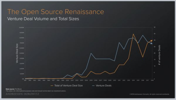就像硅谷风投A16Z说得那样,开源吞噬一切。上图所统计的是1988~2018年开源领域的融资数量及融资规模:200 家把开源作为核心技术的公司,总体融资规模超过 100 亿美元,且近十年来融资数额越来越大。