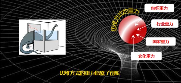 这四个层级的重力交织在一起,相互摩擦,相互助力,相互掣肘,形成重力漩涡,被思维方式的重力所裹挟,拖拽进入“重力隧道”,表现在:组织重力使得企业组织内部人员的思维趋同或相似;根深蒂固的行业重力,使整个行业的所有人员的思考和行动都遵循所谓行业规则行事。更深层次,国家和文化的重力使得人们窒息,影响了几代人,使得他们习惯了服从,而不是创新。