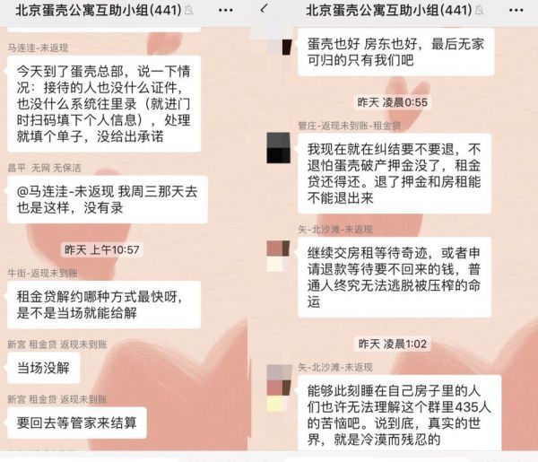 在蛋壳北京维权群中,比较集中的问题有返现未到账、被贴清退告知书、未保洁、断网、房东强行清退、房东换锁赶人、无维修等。
