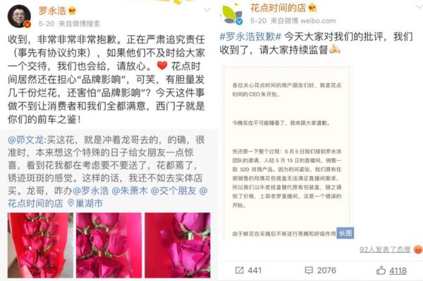 而在鲜花的主场5.20,花点时间遇上暴怒老罗微博隔空放狠话,称如果做不到“让消费者和我们全都满意,西门子就是你们的前车之鉴”。起因是5月15日,罗永浩“周”播带货,上架销售“花点时间”的玫瑰产品,将在5月20日送达用户手中,结果5月20日当天,大量用户反映,收到的是枯萎的花。随后,花点时间致歉称,除了100%退款外,再对购买者进行同等现金赔偿,或等值鲜花。