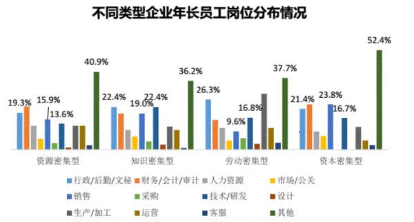 数据显示,在知识密集型企业中,年长员工从事技术、研发岗位占比22.4%,在技术、研发岗依然占据重要地位,从侧面反映出受教育水平高、知识储备丰富、经验丰富的年长劳动力仍然可以在技术创新领域继续发挥才能和余热,并且发挥引领年轻员工的作用。