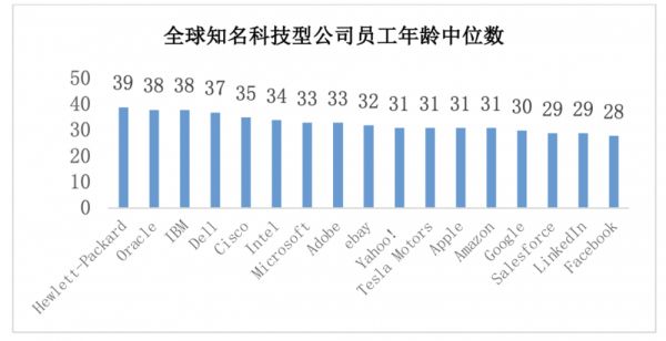2019年领英发布“中国顶尖创业公司排行榜”中,25家上榜企业员工平均年龄为28岁;2018年拉勾发布《90后互联网职场报告》的数据显示,互联网行业平均年龄26岁,其中55.8%的互联网从业者为90后;根据美国知名调查机构PayScale数据,一些高科技公司员工年龄中位数是30岁以下,如Facebook、LinkedIn;国内腾讯、华为的员工平均年龄都在28岁左右。就连中国传统家电行业、老牌国企海信集团的员工年龄也呈现出“年轻化”:2017年海信员工平均年龄30岁左右,35岁及以下员工高达67%。