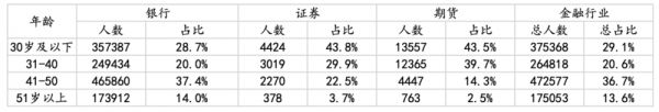 金融行业中,2017年一份数据显示,银行30岁以上员工占比高达71.3%,40岁以上员工占比51.4%,而证券、期货30岁以上员工占比分别高达56.1%、56.5%。信托行业中,30岁~39岁员工为行业主力军。2017年,共有62家信托公司披露其公司员工的年龄结构,其中,年龄在30岁~39岁的员工占比约为50%;20岁~29岁的员工占比约在30%以上,40岁以上员工占比仅为20%,全行业人均年龄在35岁左右。