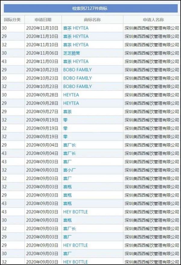通过检索国家知识产权局网站发现,喜茶所属的深圳美西西餐饮管理有限公司,目前申请注册的商标高达2127件。