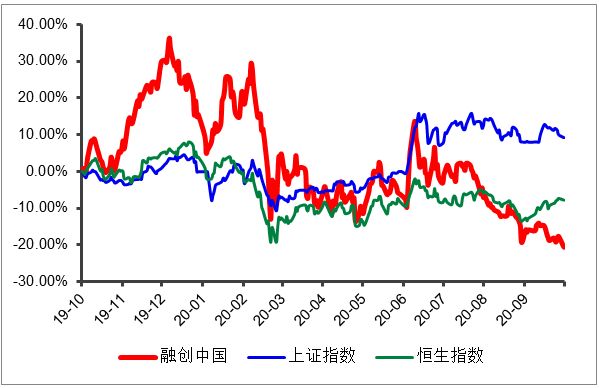 图表 1:今年以来融创中国与沪指、恒指股价走势图