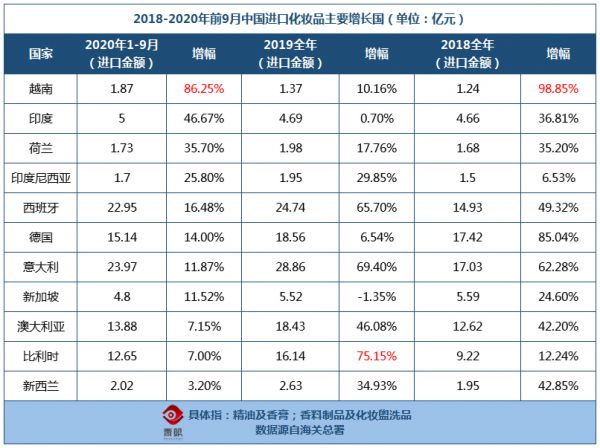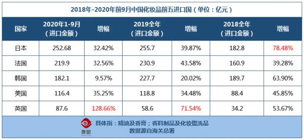 而从进口国来看,日本、法国、韩国仍为前三,小众国家化妆品也仍有不小的潜力。