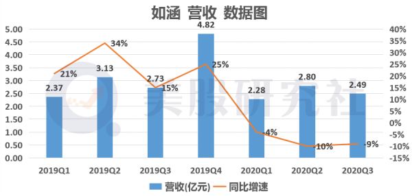 如涵最新发布的财报数据显示,营收为2.49亿元,同比下降9%,较上季度2.80亿元减少约11%。
