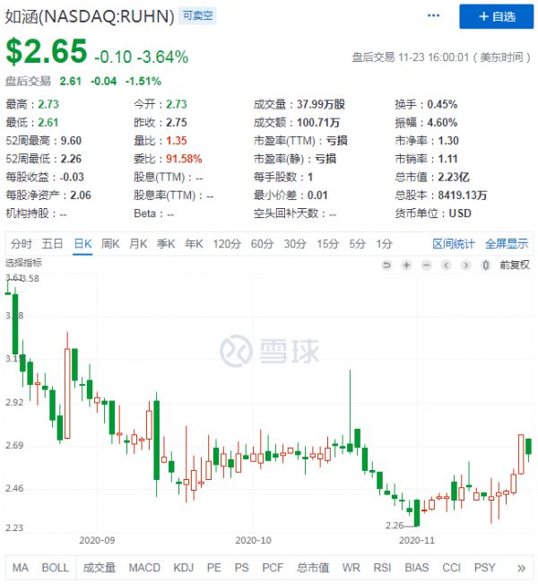 北京时间11月23日,“网红电商第一股”如涵交出了2021财年第二季度的业绩报告。其中,营收较上一季度下滑,而净亏损比去年同期有所收窄。财报发布后,如涵盘前股价一度下跌超4%。截至发稿时,股价为2.65美元,跌幅为3.64%,市值来到2.23亿美元。