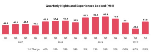 这两个数字并不乐观,不过分季度来看,Airbnb的业务确实表现出逐步恢复的趋势。2020年三季度该公司总营收13.4亿美元,同时实现扭亏,录得净利润2.2亿美元。