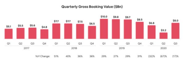 GBV(Gross Booking Value,预订总额)也是衡量酒店民宿类公司的重要指标,与电商行业较为关注的GMV(成交总额)相类似。2020年前9个月,Airbnb的累计GBV为180亿美元,较去年同期的294亿美元下降39%。其中第二季度下降最为严重,GBV下降率达到67%。随后由于旅行需求的反弹,该公司在2020年第三季度实现了GBV的增长,但仍较去年同期下降了17%。