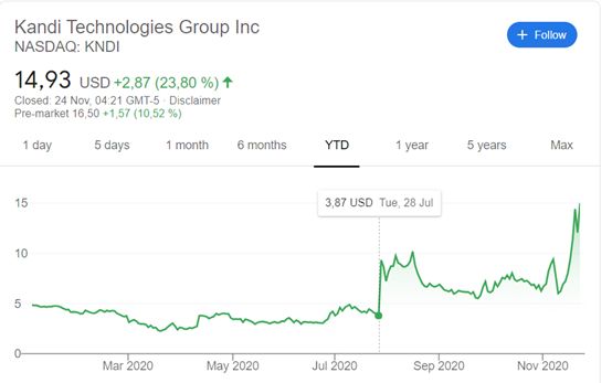 在风口上一起被吹起来的,还有一家2006年就在美股上市的中国车企——康迪车业,其股价7月底还在不足4美元徘徊,目前已经接近15美元,特别是在最近一周飙涨了80%。