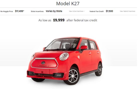 康迪车业董事长胡晓明在接受《巴伦周刊》采访时称,该公司将从12月开始在美国销售K27电动车(大小类似Mini Cooper)。K27充电一次的预估行驶里程为59英里,最高时速为68英里,售价为17499美元。市场推广信息显示,前1000名消费者可以享受9999美元的折扣价(计入税收优惠后)。