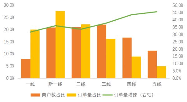 随着下沉市场对小吃消费需求的增长,三线、四线、五线城市小吃需求增速较快,小吃订单量增速分别达到37.7%、43.5%和45.5%。