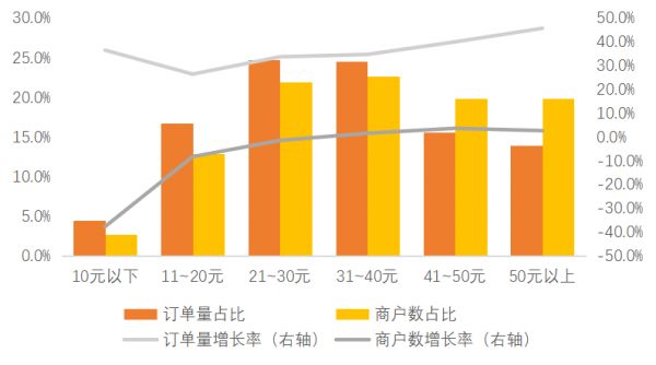 美团平台大数据显示,2019年小吃品类人均消费价格为33.9元,30元以上的订单量占比为54.0%,交易额占比为73.8%,成为小吃品类的主力消费区间,且41-50元及50元以上价格区间的订单量增速较快,分别达到40.0%和45.7%,远高于小吃品类整体35.3%的增速。