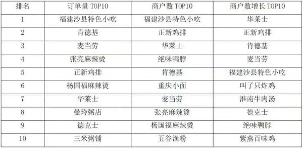 美团平台大数据显示,2019年小吃品类店铺数量排名前五的品牌是福建沙县特色小吃、正新鸡排、华莱士、绝味鸭脖、肯德基;新增商户增长最快的品牌是华莱士、正新鸡排、肯德基、麦当劳、福建沙县特色小吃;订单量排名前五的品牌为福建沙县特色小吃、肯德基、麦当劳、张亮麻辣烫、正新鸡排。