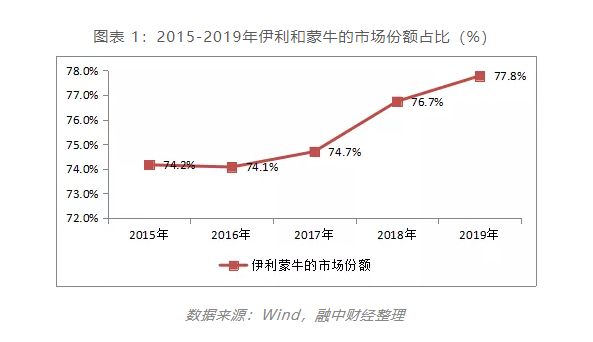 据融中财经统计,2015年,伊利和蒙牛的营收分别为598.63亿元和490.27亿元,合计1088.9亿元,而当年主要乳企上市公司的营收合计为1468.38亿元,两者所占市场份额达74.2%。