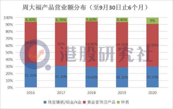 . 按产品来看,周大福在这六个月内,由于受到国际金价急升的影响,黄金首饰及饰品的营业额于2021财政年度上半年下降21.2%,但在整体营收中占比仍然超过60%。不过由于中国内地在国际旅游限制下出现强大的国内需求,促使期内钟表营业额录得17%的强劲增长。