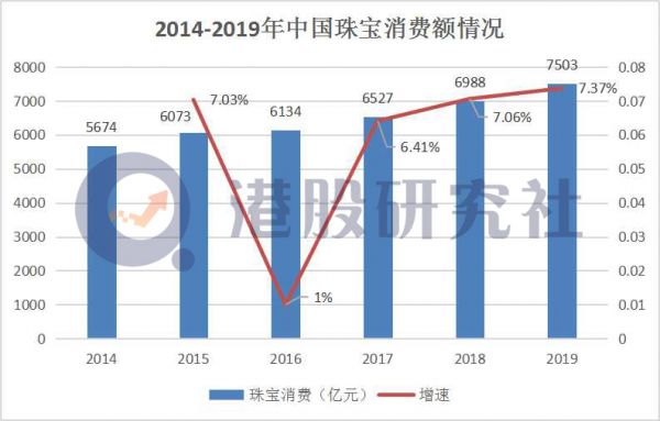 受这些因素叠加的影响,我国珠宝行业市场规模一直在稳定上升。2014-2019年,我国珠宝消费额逐年增长,2019年达到7503亿元,同比增长7.37%。