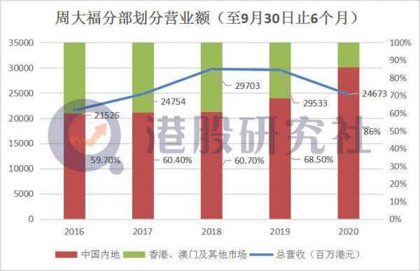 . 截至2020年9月30日止的六个月内,周大福半年的营业额下跌16.5%,受惠于国际金价急升使经调整后的毛利率有所改善,周大福报告期内主要经营溢利上升15.6%,2021财政年度上半年的主要经营溢利率上升至16.5%。