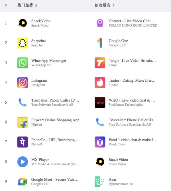 Snack Video在印度热门免费排行榜中排行第一,创收榜中排名第八/EVA数据