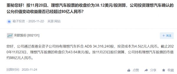 日前,利欧股份在互动平台上表示,公司通过香港全资子公司持有理想汽车折合ADS(美国存托股份)为3431.624万股,投资成本为4.5亿元。截止11月23日,公司持有理想汽车股票的市值约98亿元人民币。