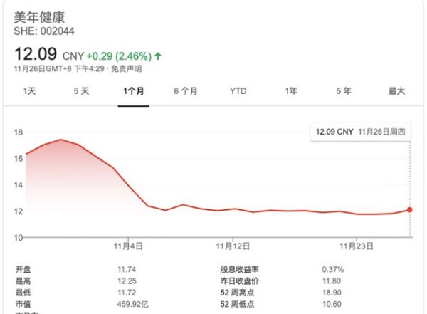 自10月30日起,6天内,美年健康股价暴跌,从17.43元/股跌至12.05元/股,跌幅约为30%,市值蒸发近200亿元。如今已近一个月,美年健康的股价仍未有起色,截至11月26日,收盘价为12.09元/股,市值459.92亿元。
