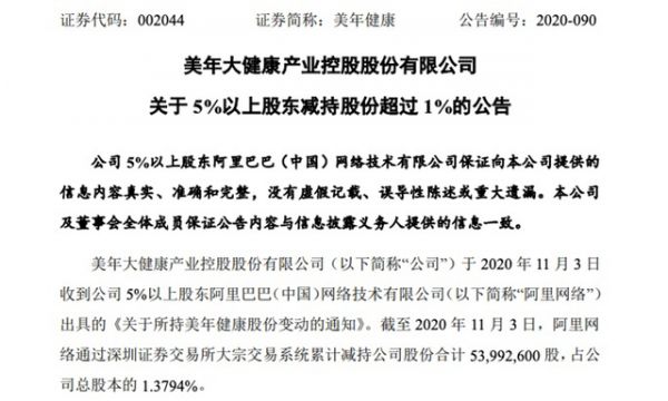随后,大股东阿里系开始减持。11月3日,阿里系减持5399万股,占公司总股本的1.38%。
