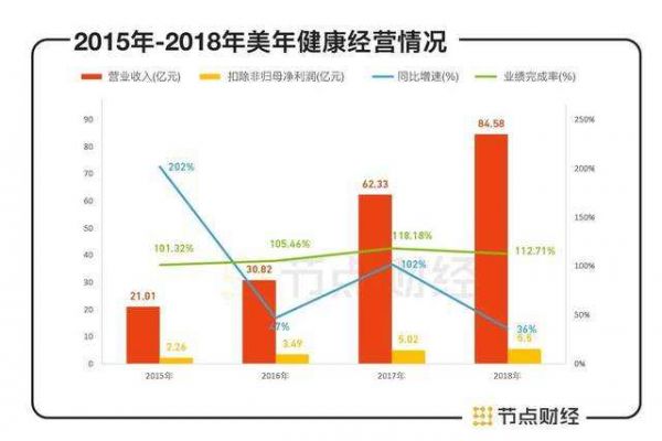 这是美年健康激进扩张的后遗症。2015年,美年健康借壳江苏三友上市。为了完成业绩承诺,美年健康在2015-2018年交出了一份漂亮的“成绩单”——公司营业收入分别为21.01亿元、30.82亿元、62.33亿元、84.58亿元,同比增速分别为202%、47%、102%、36%。公司实现扣非归母净利润分别为2.26亿元、3.49亿元、5.02亿元及5.5亿元,业绩完成率分别为101.32%、105.46%、118.18%、112.71%。