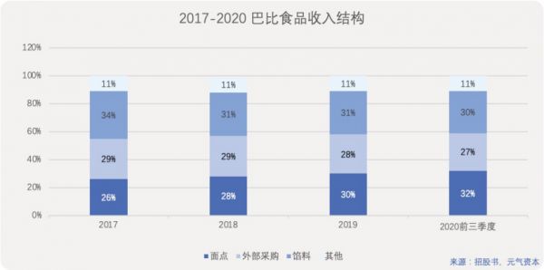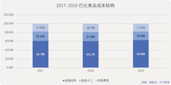 从成本结构拆分来看,巴比符合食品公司特征,直接材料的占比最大。