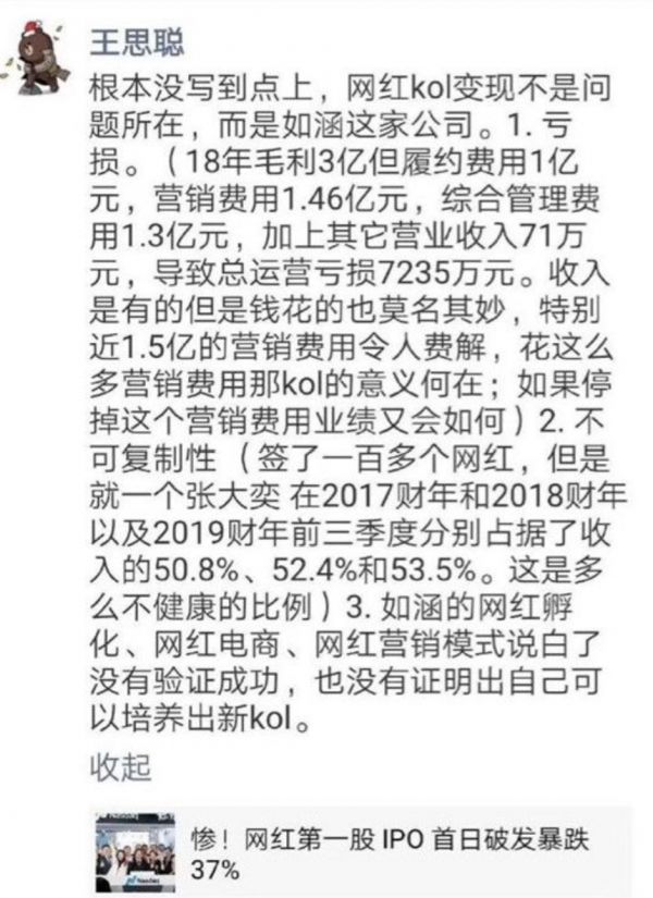 那时,永远活跃在吃瓜前线的王思聪在朋友圈提出三点质疑:一是如涵处于亏损中,每年1.5亿的巨额营销费用令人费解;二是如涵当时超过50%收入的张大奕,不具备可复制性;三是如涵的网红孵化、网红电商、网红营销模式都没有被验证成功,也没有培养出新的网红来。