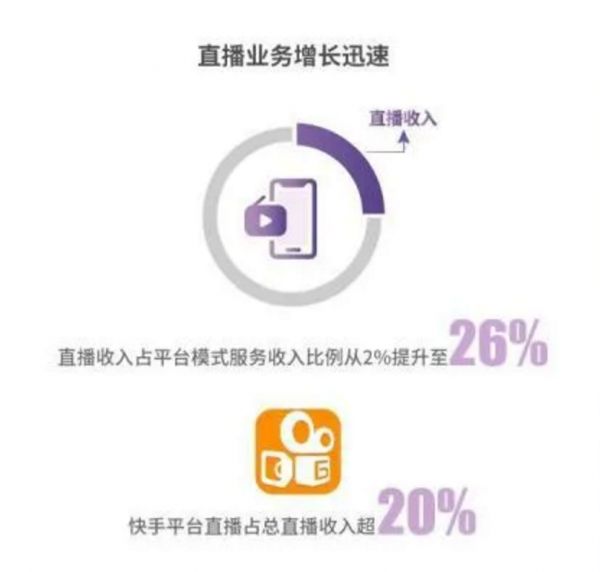 在代运营业务中,来自直播业务的收入增速较快,在平台服务总收入的占比增长至26%,快手平台直播在总直播收入中占比超过20%。