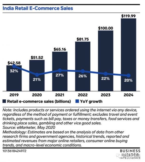 Business Insider针对印度零售电商销售额的预测