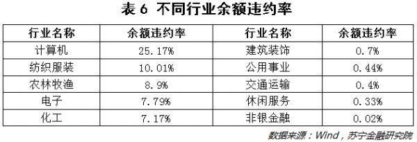 分行业来看(见表6),计算机、纺织服装、农林牧渔等行业今年以来的信用状况恶化明显,而非银金融、休闲服务、交通运输等行业维持良好的兑付记录。违约率在行业上存在分化的原因是,不同行业具有不同的盈利能力、处于不同的景气周期、面对不同的产业政策、拥有不同的现金流量特征等,因此若某一行业出现集中违约,那么同行业的企业所面临的偿债压力和再融资能力均需着重关注。