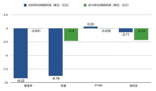 在线教育机构能够做到盈利的不多,这四家教育企业中,2019年Q3,没有一家盈利,到了2020年,51talk的税前利润由负转正,流利说的亏损在收窄,反观跟谁学和有道,一个亏得比一个狠。
