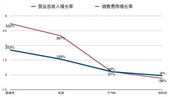 51Talk的销售费用和营业收入几乎是同步增长的,均为31%左右。而流利说,罕见地减少了销售费用支出,同比下降36%,收入也同比下降了9%。