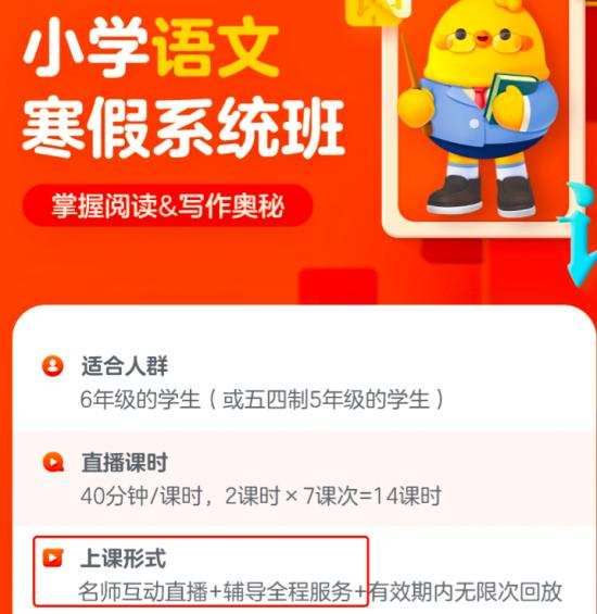 目前,有道的主流课程也均为双师大班。比如一个针对六年级的寒假语文班,采取的方式就是双师: