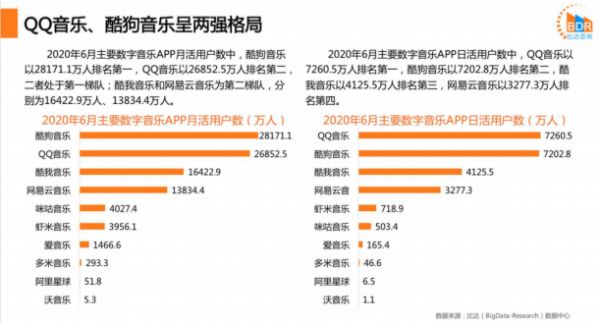 从比达咨询最新的数据来看,2020年上半年腾讯系三大在线音乐平台的日活和月活都遥遥领先其他平台,虾米音乐跌出前四,在月活上甚至不及咪咕音乐。