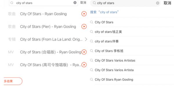 左为虾米搜索页面,右为网易云音乐搜索页面