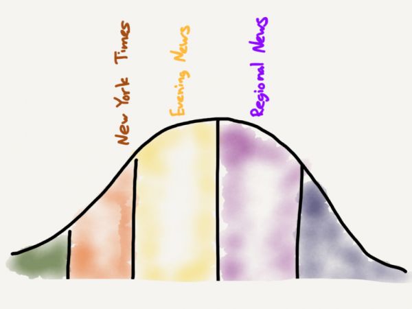 我上个月写了《纽约时报》在设定美国的新闻议程方面所发挥的传统作用。《纽约时报》早上的头条新闻就是晚上国家新闻广播的头条新闻,第二天则是区域性报纸的头条新闻。如果把这种情况映射到摩尔的模型上的话,则可能看起来会像这样: