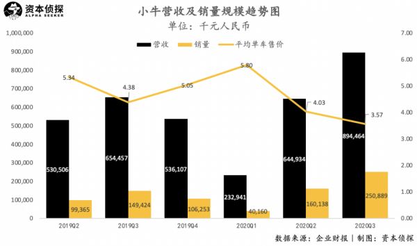 此外,影响营收增速的更核心原因在于,小牛平均单车售价一再降低,三季度已跌破四千元。通过高端市场建立品牌效应,再通过平价产品走量,是特斯拉、蔚来所采用的发展战略,但小牛对这一战略的具体实践并不理想,对低价车型的日益依赖,拖累了营收的增长速度,也一定程度上缩小了小牛与其他电动车品牌相比的差异性。