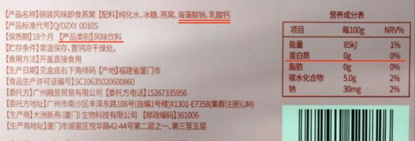 这款商品包装上还标注了“固形物不低于50%”,即食燕窝里的固形物看似是非常有价值的,但其中实际包含了冰糖,以及海藻酸钠和乳酸钙等成分。