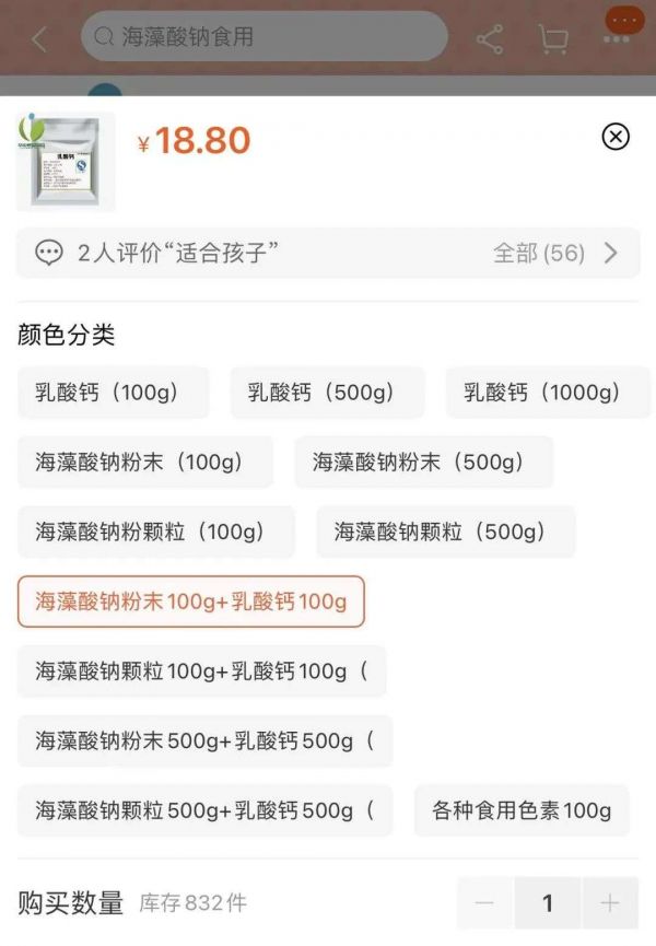 深燃在淘宝搜索发现,海藻酸钠、乳酸钙的成本极其低廉 来源 / 淘宝