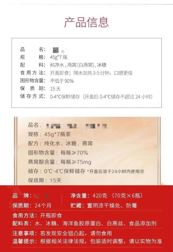 祁杭给深燃发来了到货产品的实物照片,“那就是糖水,哪有什么燕条和固体物”。他表示,他收到的货品里,固体物只有2%甚至更少,和包装上的标注明显不符。