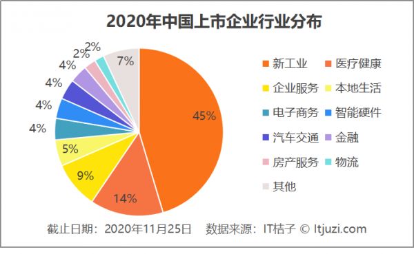 IT 桔子数据显示,2020 年新上市中国企业中「新工业」领域数量最多,共计有 197 家,占比 45%,同比增长 52%。