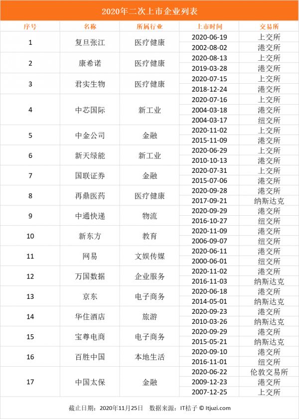 截止至 2020 年 11 月 25 日,IT 桔子观察到今年有超过 10 家公司为二次上市,除了前文所述京东、网易、新东方等,物流企业中通快递(2020-09-29)、创新药研究开发销售商再鼎医药(2020-09-28)、云服务提供商万国数据(2020-11-02)、酒店预订平台华住酒店(2020-09-23)、电商解决方案宝尊电商(2020-09-29)以及必胜客肯德基母公司百胜中国(2020-09-10)均为二次在港股挂牌。