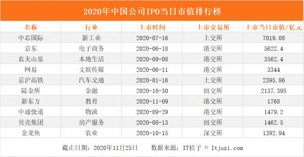 排行前五位的分别是中芯国际、京东、农夫山泉、网易和京沪高铁。其中在科创板 IPO 的中芯国际上市当日市值达到了 7019 亿元,市盈率惊人。
