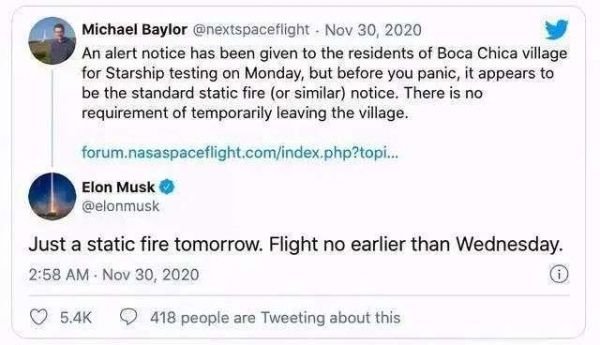 埃隆·马斯克的火星移民梦又前进了一小步。日前他在推特上透露,Starship SN8原型机最早可能会在美国时间12月2日开始飞行。此前,11月25日,SpaceX升空了第16批星链卫星,并且成功回收了一枚7手运载火箭“猎鹰9号”。
