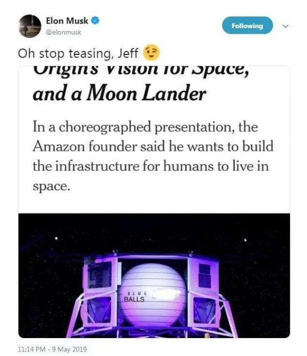 2019年5月10日,贝索斯揭晓了蓝色起源的月球探索计划,并亲自在展示了月球着陆器蓝月亮(Blue Moon)。马斯克当天发推嘲弄,在Twitter上发布了一张经过修改的“蓝月亮”照片,登陆器侧面的名字被改成了“蓝球”。