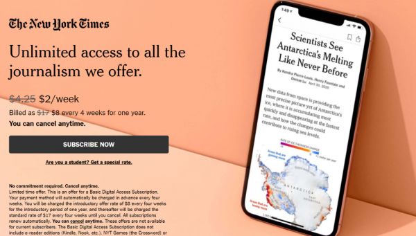 为此,《纽约时报》奉行的战略是:强调自己并不走流量路线,而是坚持“订阅优先”(subscription-first)。“我们对订户的关注使我们迥异于其他媒体组织。我们并不试图最大化点击率并以此出售低利润的广告。我们不在意赢取浏览量的竞赛。我们认为,更合理的商业策略是提供强大的新闻,让全球数百万人愿意为此付费。当然,这一策略也与我们的长期价值观保持了一致。”